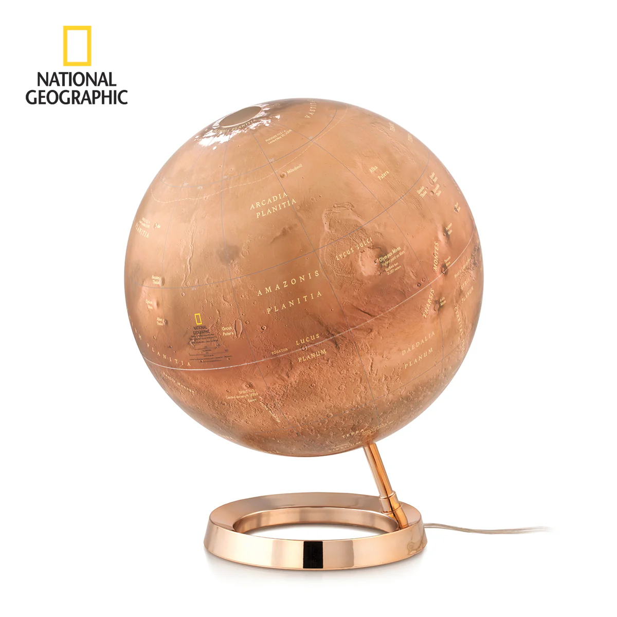 Mars -karttapallo esittelee tarkasti planeetan pinnanmuodot, alueet ja nimistön. Kartografinen tieto perustuu Marsia kiertäneiden luotainten ottamiin tuhansiin kuviin, joten se vastaa niin väreiltään kuin pinnanmuodoiltaankin todellista Mars -planeettaa. Tehty yhteistyössä mm. NASAn kanssa, taattua National Geographic -laatua. Pallon halkaisija on 30 cm, kokonaiskorkeus 40 cm, kuparinvärinen teräsjalusta, ledvalo. Karttapallon mukana tulee lehtinen, jossa on lisätietoa planeetasta ja sen pinnamuodoista sekä Phobos- ja Deimos -kuista.