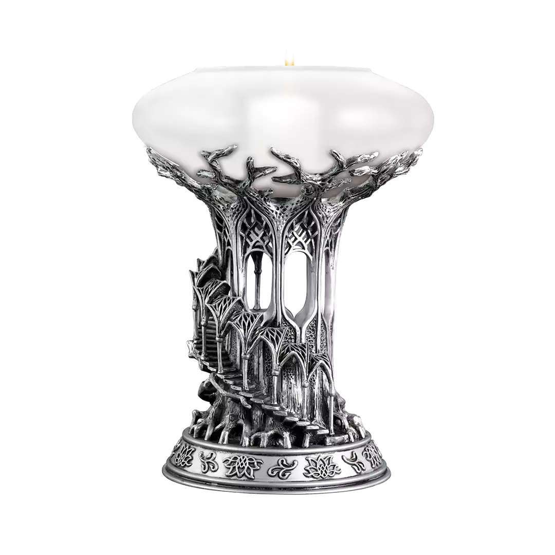 Lothlórienin salaperäinen haltioiden maa oli Taru Sormusten Herrasta -romaanissa alue, jonka läpi Sormusten saattue kulki matkallaan kohti Tuomiovuorta. Maata hallitsivat Celeborn ja Galadriel. Tähän upeaan metalliseen kynttilänjalkaan on ikuistettu elokuvassa nähty Lothlórienin linna kierreportaineen ja holvikaarineen. Lasinen kynttilänjalka on suunniteltu siten, että siihen sopivat monen kokoiset kynttilät. Siinä voi myös käyttää kelluvia tuikkuja, kunhan pitää huolen, että astia on aivan täynnä vettä (etteivät kynttilät osu lasireunoihin). Keräilyharvinaisuus. Korkeus 24 cm, leveys 18 cm.